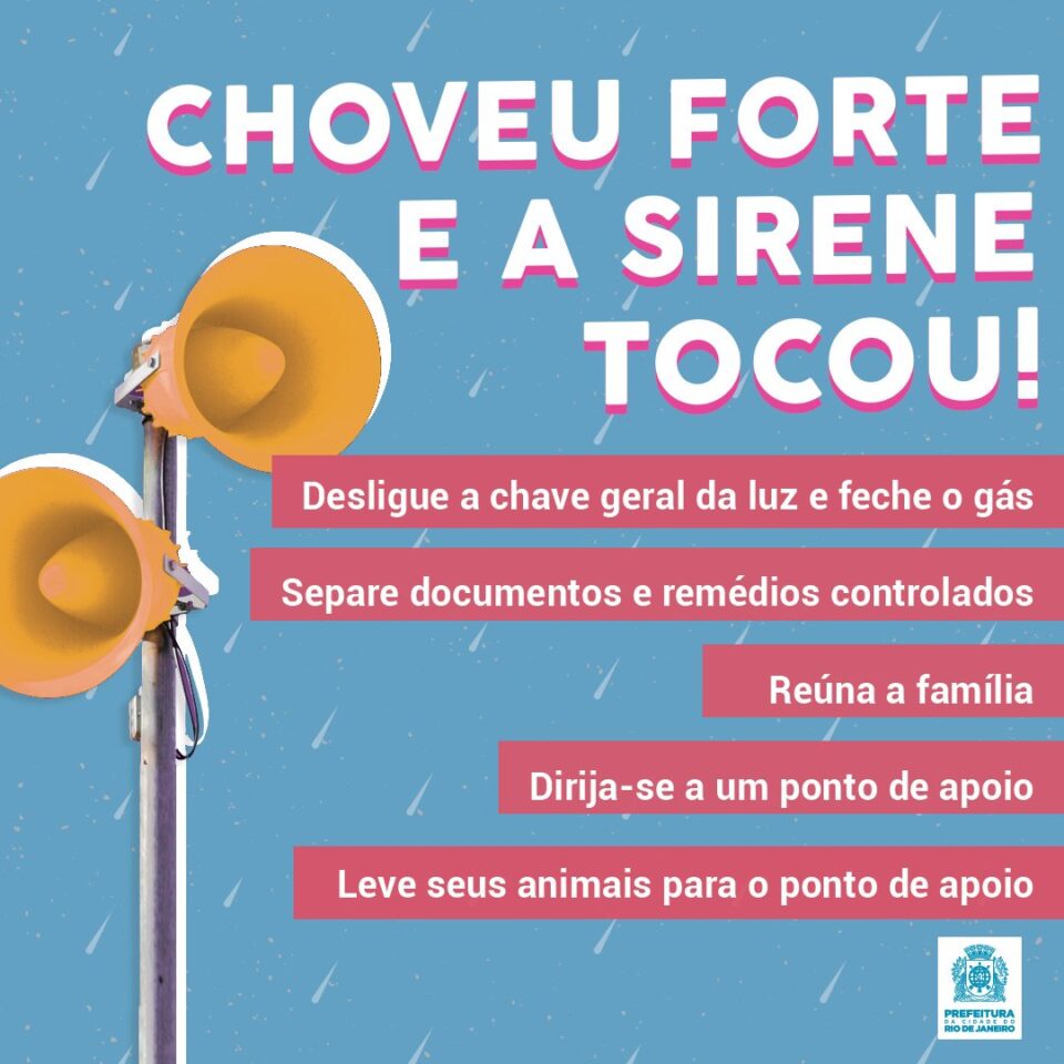 ? Prefeitura RJ Alerta, o que fazer no Rio com em caso de chuva forte? Fique em casa. Se você é morador de área de risco, fique atento às sirenes da Defesa Civil. Elas indicam o risco de deslizamento e, em caso de acionamento, procure os pontos de apoio. Na dúvida, ligue 199. #ChuvaRJ