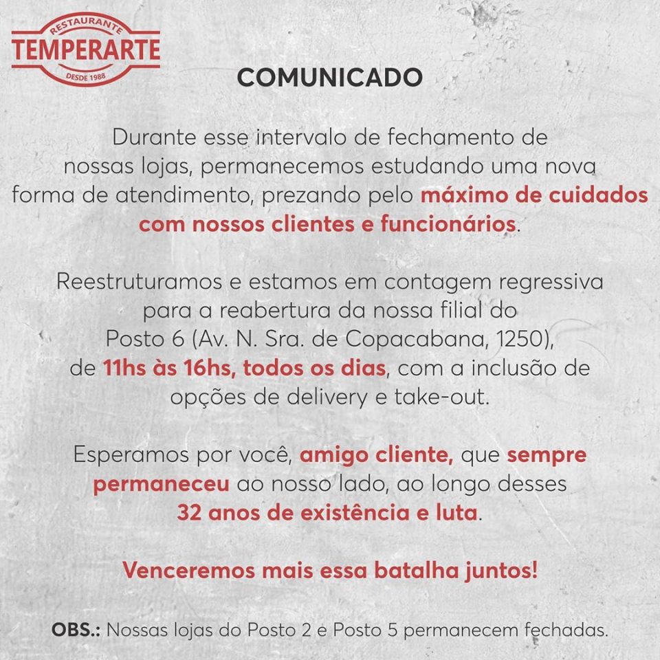 Ao longo dos seus 32 anos de existência, e em comunicado recente do Restaurante Temperarte Copacabana no seu perfil do Instagram, a Filial do Posto 6, na nossa senhora de copacabana, 1250 se prepara para a reabertura.